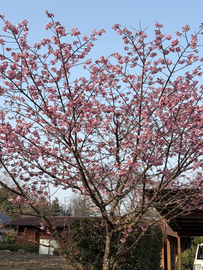 事務所近くの駐車場に一本満開の桜の木があります。この桜の種類がわからなくて…八重桜?それとも少し早咲きの河津桜なのか?町内でも時々見かけるので気になってるところです。